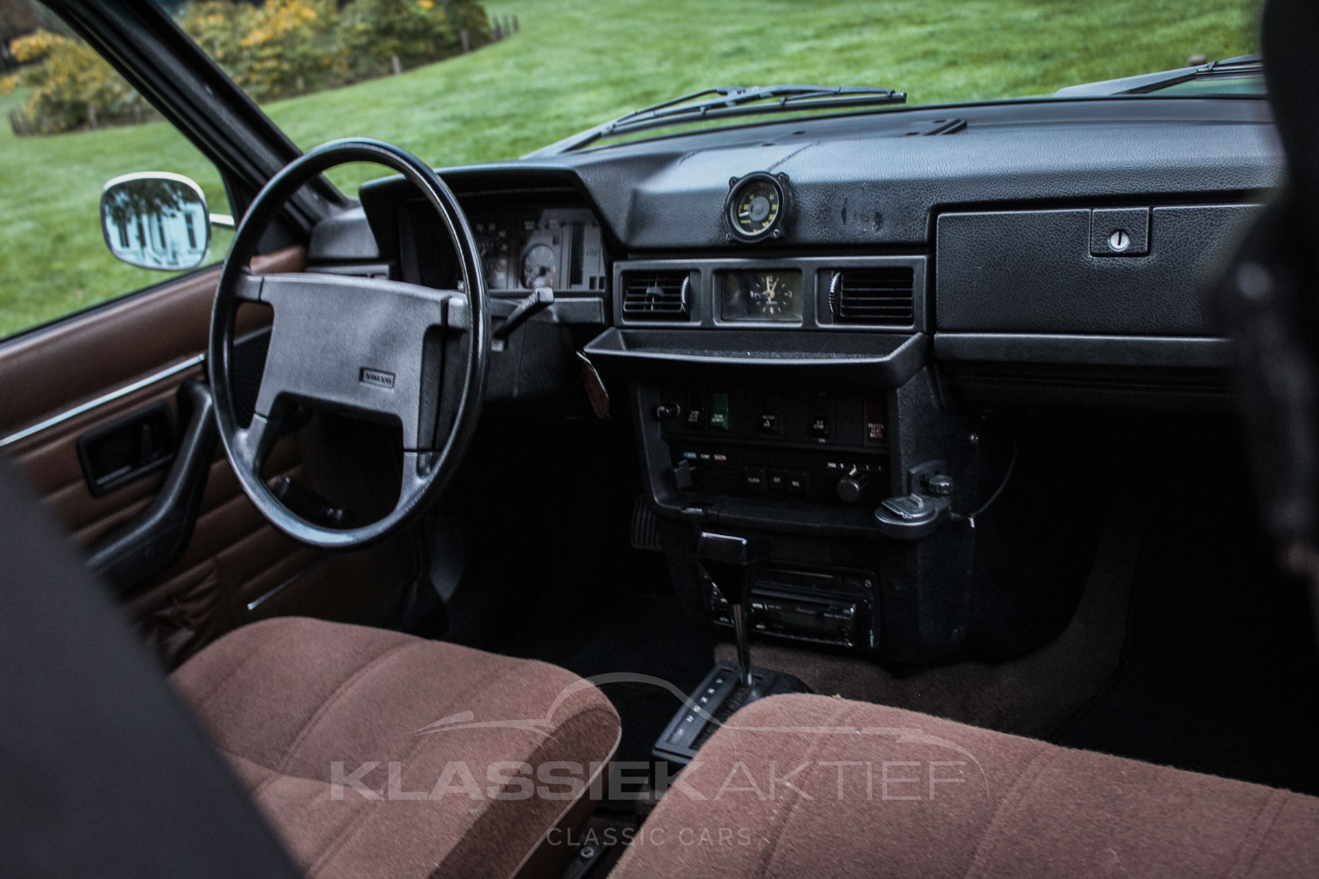 Ook het interieur van deze Zweedse stationwagon is in zeer goede staat. De bruine stoffen bekleding is in zeer goede conditie en de stoelen zitten bijzonder comfortabel. Het dashboard is in zeer goede staat en alle instrumenten werken naar behoren. Het vloertapijt en overige interieurbekleding is ook in zeer goede staat en dat geldt ook voor de hemelbekleding. We hebben zelden een auto in zo’n originele en perfecte conditie gezien. Deze auto is overigens ook voorzien van twee extra (wegklapbare) zitplaatsen in de kofferruimte. Deze zitplaatsen zijn in 2007 achteraf gemonteerd, maar was in 19777 ook als originele accessoire verkrijgbaar op deze auo.